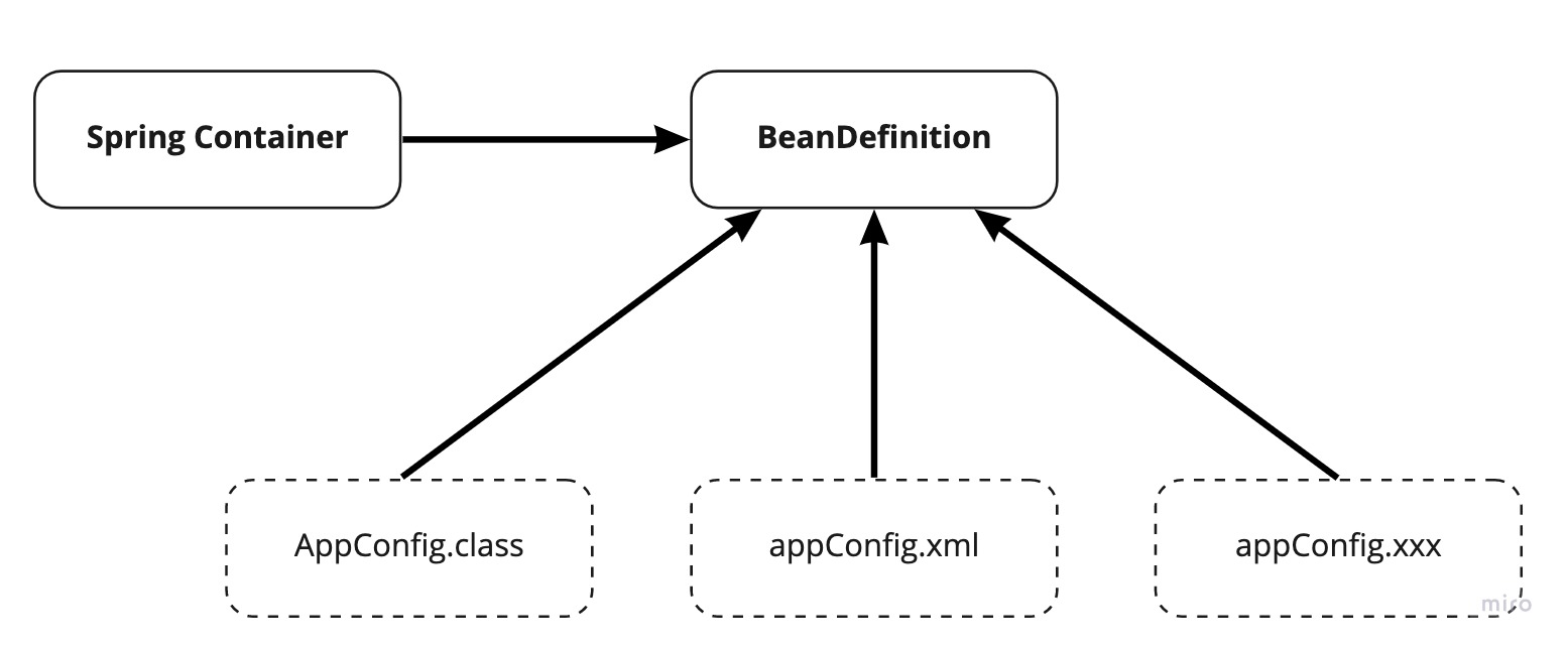 위 그림과 같이 Spring Container 는 BeanDefinition 에만 의존한다. 그것이 무엇으로 만들어졌는지는 관심사가 아니다.