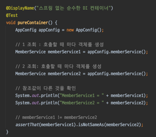 스프링이 아닌 순수한 DI 컨테이너인 AppConfig 는(싱글톤 구현이 아닌 경우) 위와 같이 여러 요청이 생길 때 마다 해당 서비스를 책임지는 객체 인스턴스를 매번 생성하는 문제가 발생한다.