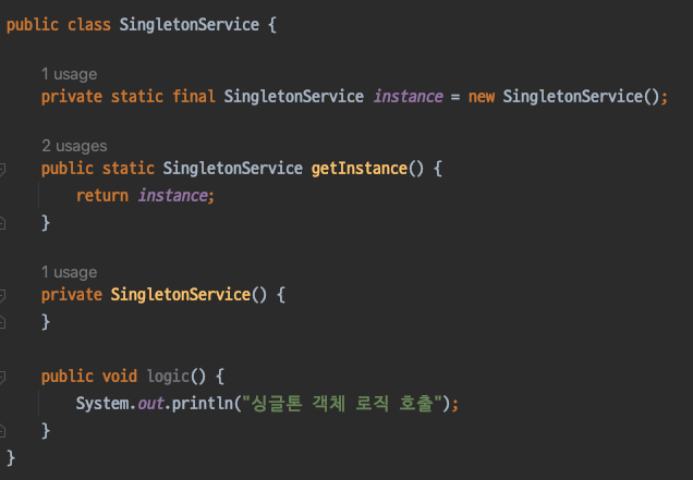 - 생성된 인스턴스가 필요하면 오직 getInstance static 메서드를 통해서만 조회할 수 있도록 한다. (해당 메서드는 항상 같은 인스턴스를 반환한다.)