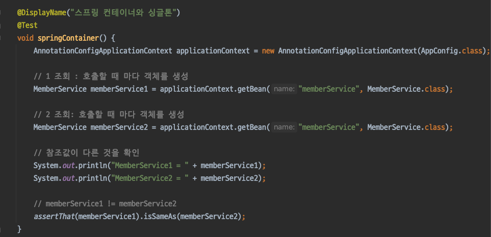 참고 - 스프링의 기본 빈 등록 방식은 싱글턴이지만, 싱글턴 방식만 지원하는 것은 아니다. 요청할 때 마다 새로운 객체를 생성해서 반환하는 기능도 제공한다. (해당 내용은 스프링 빈의 생명주기에서 다뤄질 예정)