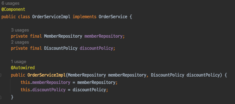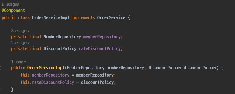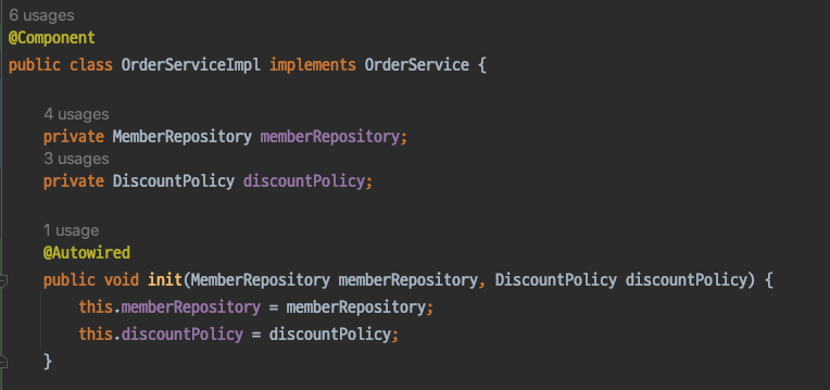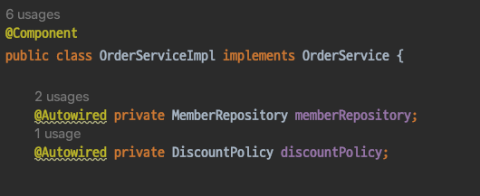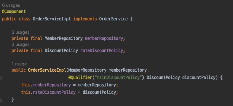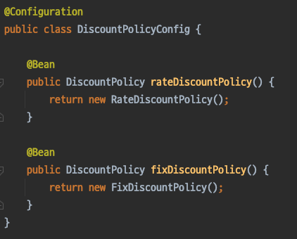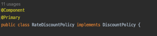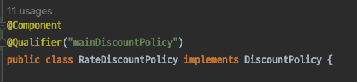 예시) DiscountPolicy 인터페이스 구현하는 구현체 두개가 있고 모두 빈으로 등록된 경우 (RateDiscountPolicy, FixDiscountPolicy)