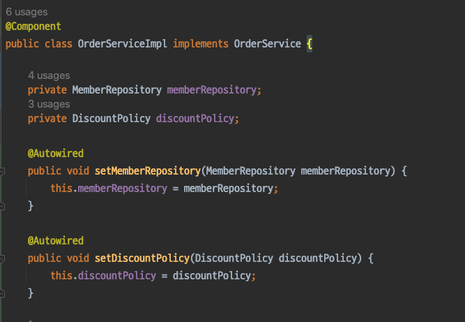 - 선택, 변경 가능성이 있는 의존관계에 사용 (required = false, 외부에서 호출하여 저장 - 거의 없는 경우)