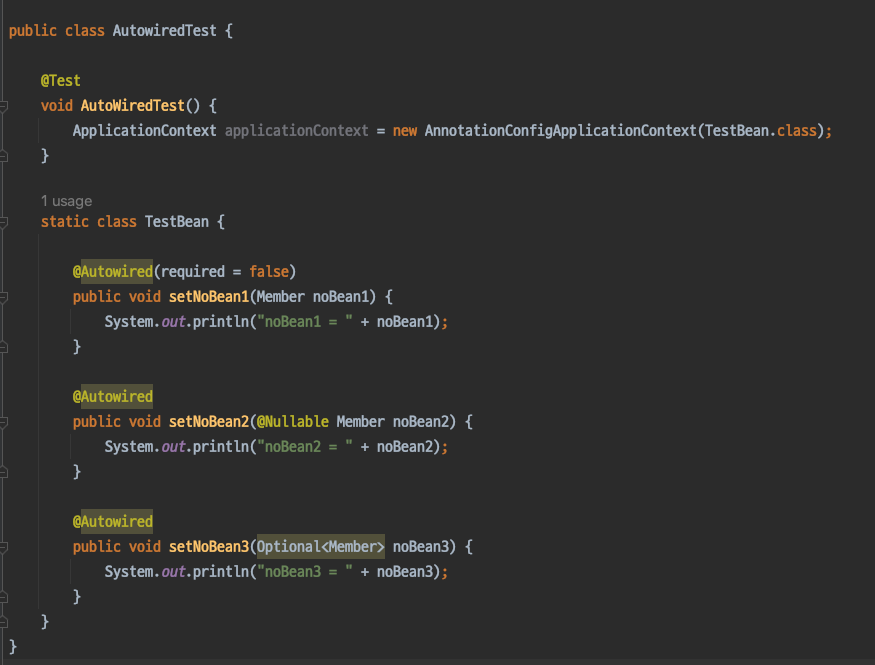 ※ @Autowired 의 기본 동작은 주입할 대상이 없으면 오류가 발생한다. 주입할 대상이 없어도 동작하게 하려면 @Autowired(required = false) 로 지정하면 된다.