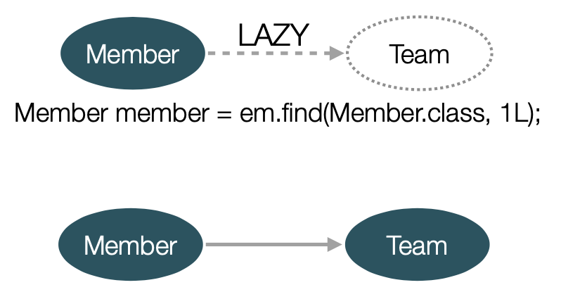- 반대로 XtoMany 관계의 경우 기본이 지연 로딩